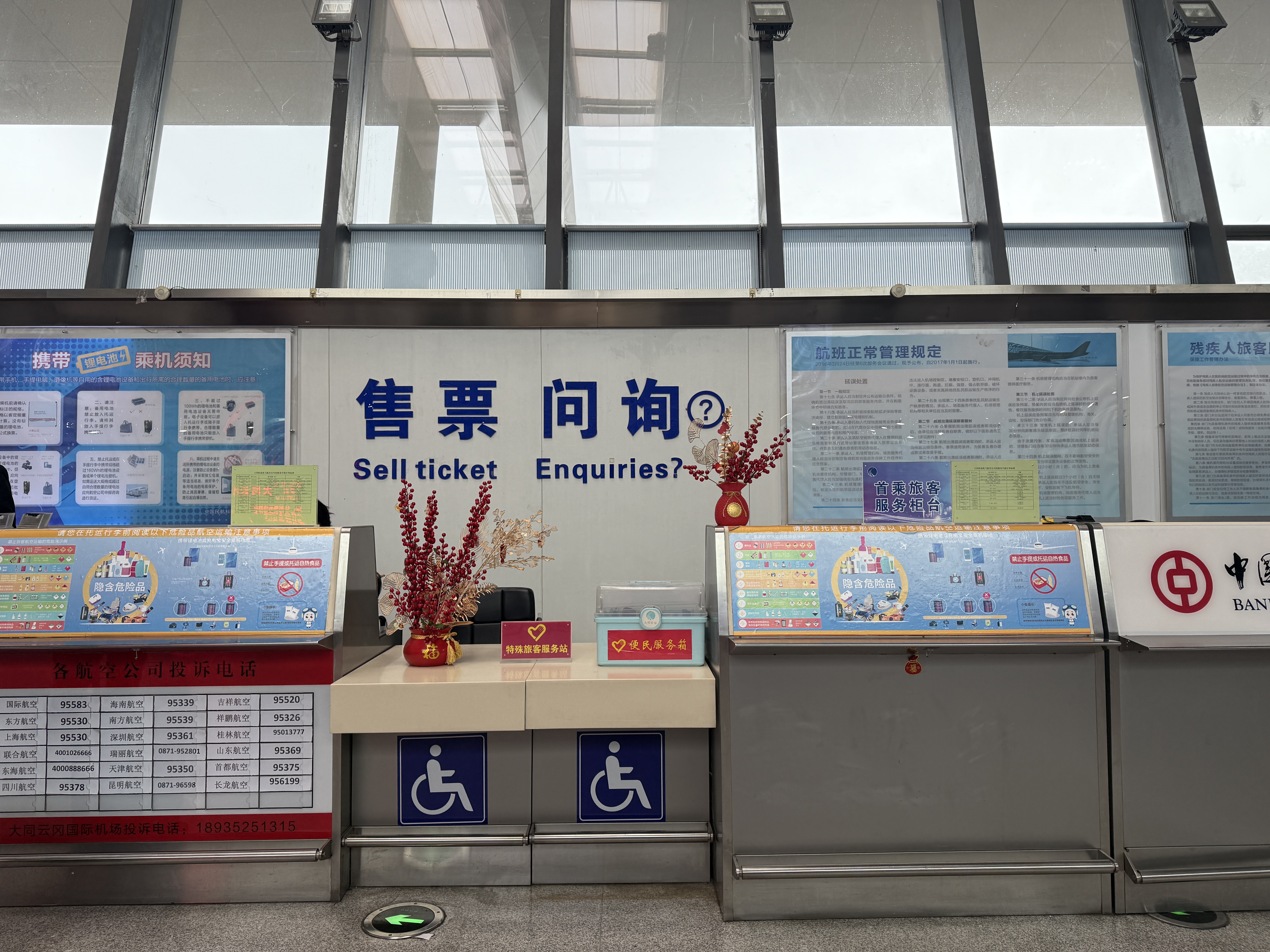 大同云岡機場客票服務柜臺設于T2國內航站樓內,由寶華國旅代理銷售各航空公司機票。暫不提供行程單打印業務。